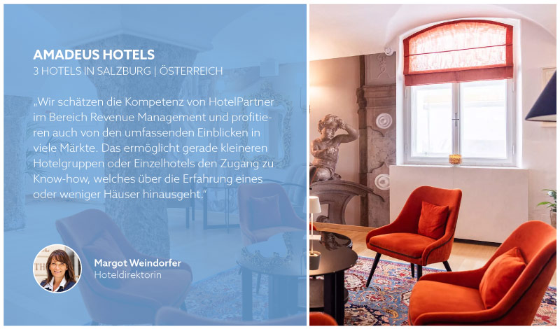 Man könnte meinen, dass für ein Unternehmen wie Amadeus Hotels, das sich seit vielen Jahren im Bereich Revenue Management profiliert, Outsourcing keine Option ist. Margot Weindorfer erklärt, warum das ein Trugschluss ist: „Gerade kleinere Häuser mit weniger Mitarbeitern haben es schwer, mit der rasanten technologischen Entwicklung Schritt zu halten. Wir schätzen die Kompetenz von HotelPartner im Bereich Revenue Management und profitieren auch von den umfassenden Einblicken in viele Märkte. Das ermöglicht gerade kleineren Hotelgruppen oder Einzelhotels den Zugang zu Know-how, welches über die Erfahrung eines oder weniger Häuser hinausgeht.“